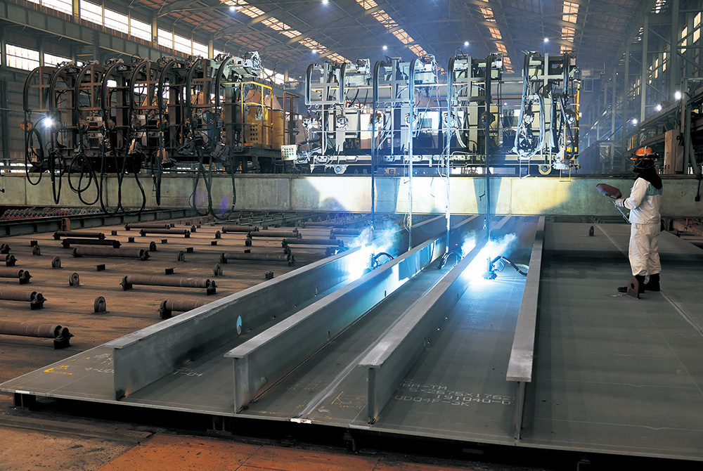 大分事業部より供給される船体ブロックを170トンクレーンで水切りし、工場の全長にわたって移動可能なゴライアスクレーン(570トンと130トン)で大組するなど、効率的な船舶の建造が可能です。